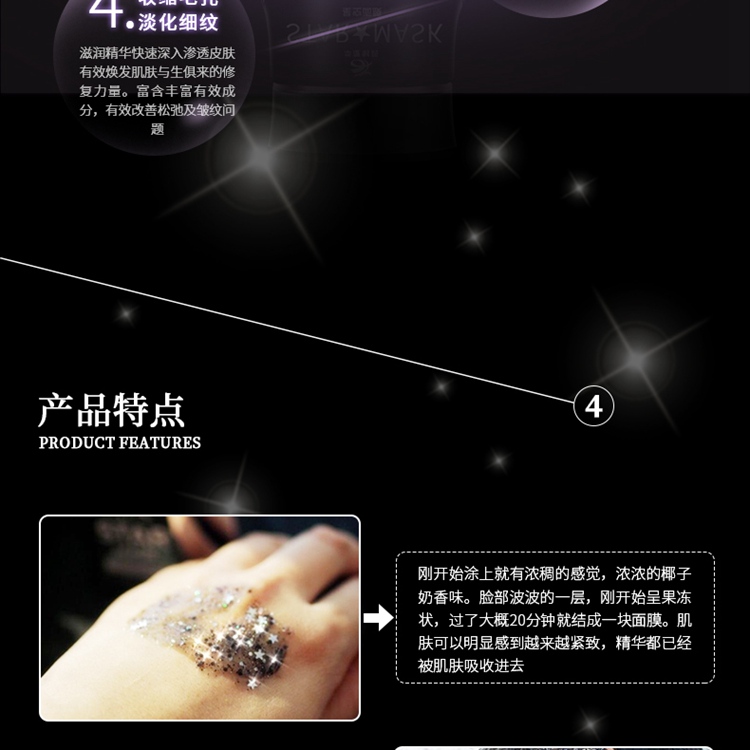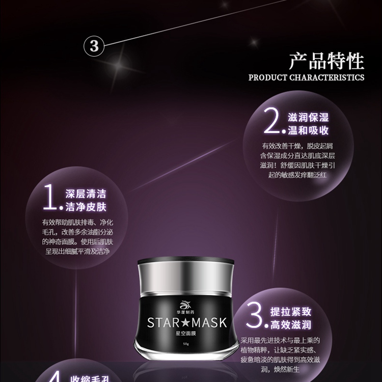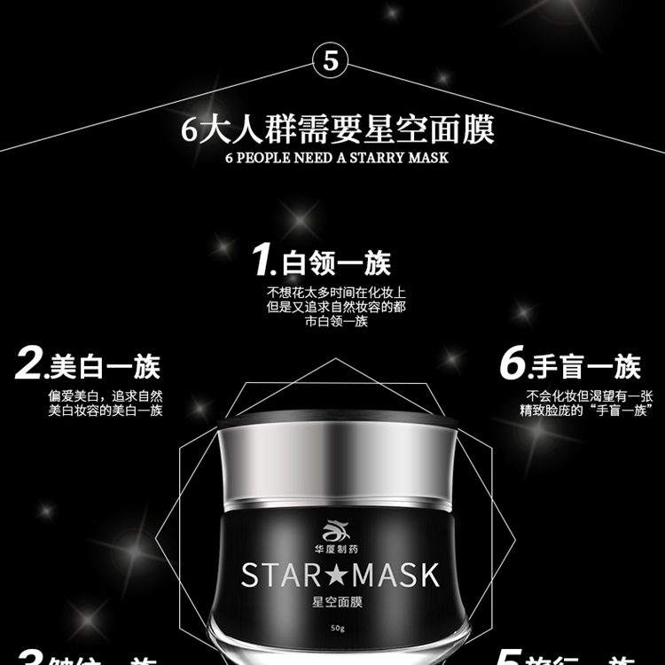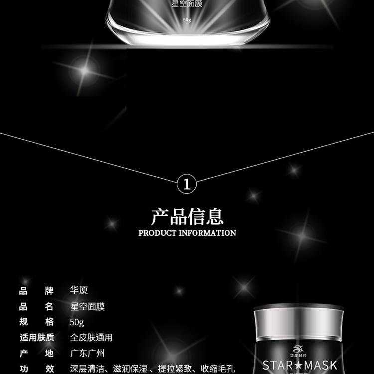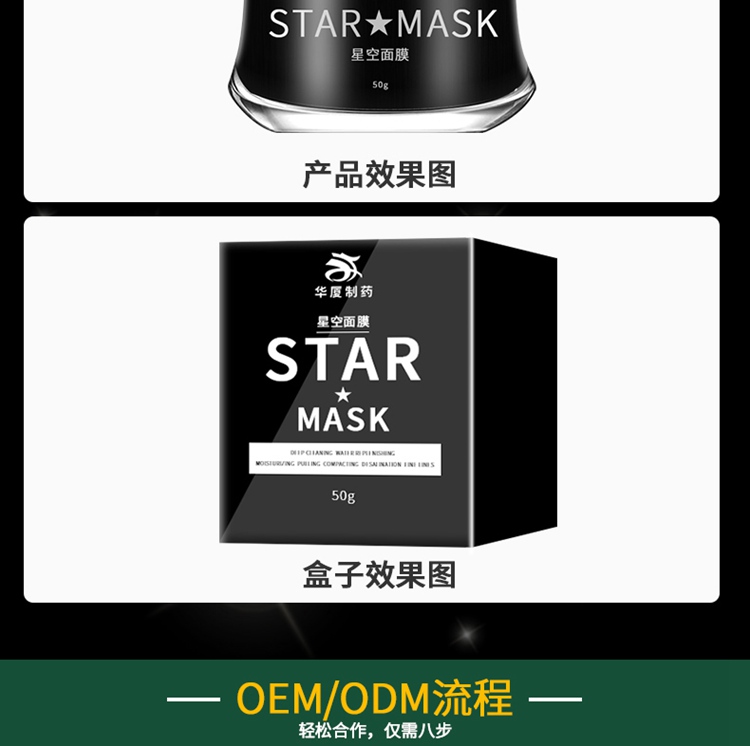華廈星空面膜,顏值控毫無抵抗力。此款產(chǎn)品特別適合微商客戶,迷人的外觀,加上滋潤(rùn)保濕、深層清潔、提拉緊致、收縮毛孔的各種功效。別家產(chǎn)品只是在包裝上bling,而專注化妝品代加工的廣州華夏生物制藥有限公司則直接將星星小亮片放到了面膜里,打開蓋子的一瞬間,感覺像是看到星空被裝在了罐子里,美的不行。