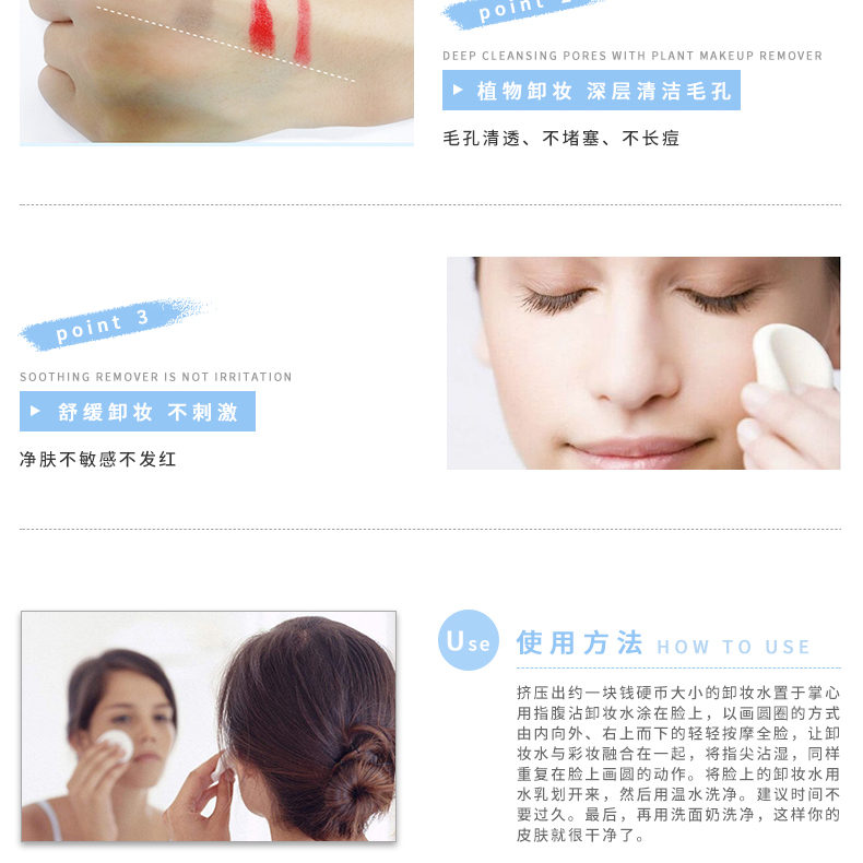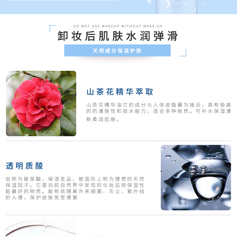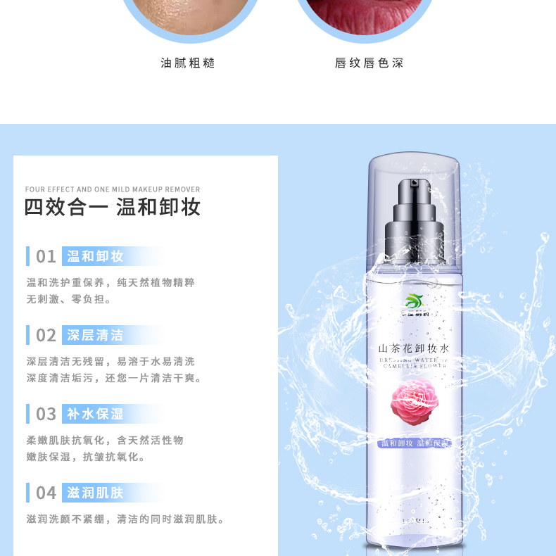 山茶花卸妝水特有水溶及油溶份子,可溶解面上及毛孔內(nèi)的的污垢。 感覺得到的毛孔乾凈 天然山茶花植物精華趕走潔面後的繃繃緊。水般的清爽質(zhì)感 如水般的清爽質(zhì)感,沒有一般潔膚油或那種笠黏黏感覺。通過水潔膚程序將只需倒適量在潔膚棉上後,往面部輕輕一抹,污垢立即變走,無須再過水。