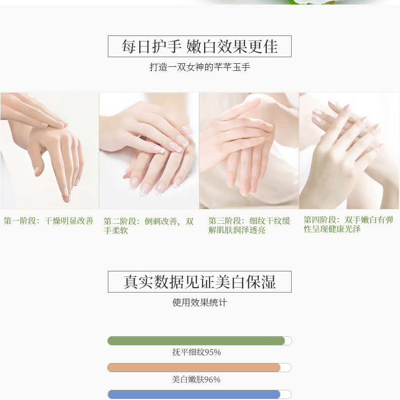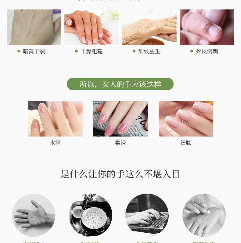 自古以來,對(duì)于女人的溢美之詞除了美麗的面龐和窈窕的身材外,恐怕就非一雙玉手莫屬了。《詩經(jīng)》中有“手如柔荑”之說,《古詩十九首》中又有“纖纖擢素手”之說。當(dāng)身著精致時(shí)裝出場的你,不想伸出的卻是一雙干燥粗糙的手,將是何等尷尬。