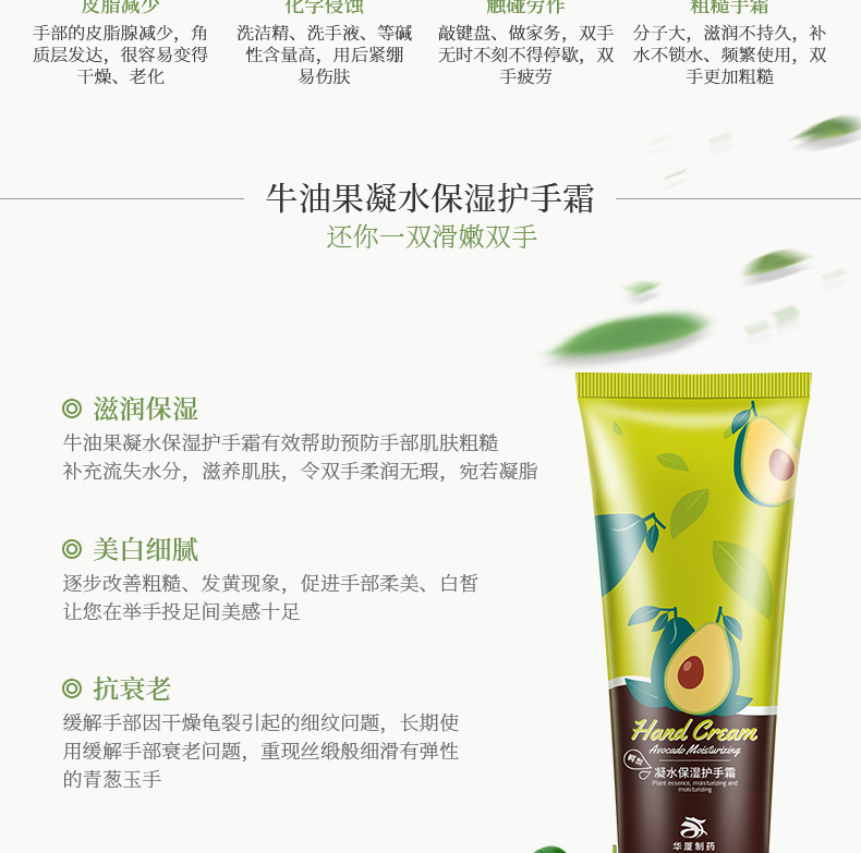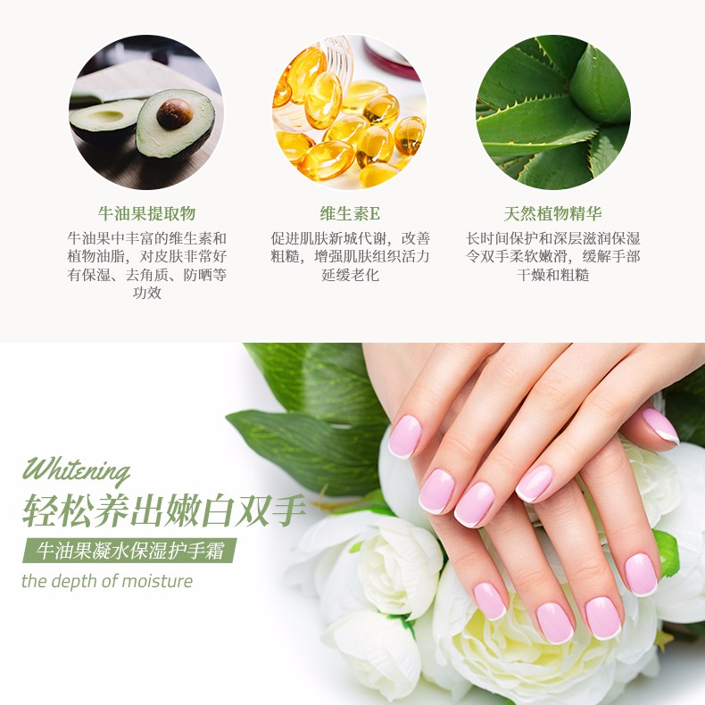 華廈牛油果護(hù)手霜,特別添加牛油果提取物,愈合及撫平肌膚裂痕。有效預(yù)防及治療秋冬季手部粗糙干裂。豐富滋潤,尤其適合秋冬季使用。愈合及撫平肌膚裂痕,干燥,能夠有效預(yù)防及治療秋冬季手部粗糙干裂。秋冬季節(jié)經(jīng)常使用可以使手部皮膚更加細(xì)嫩滋潤。